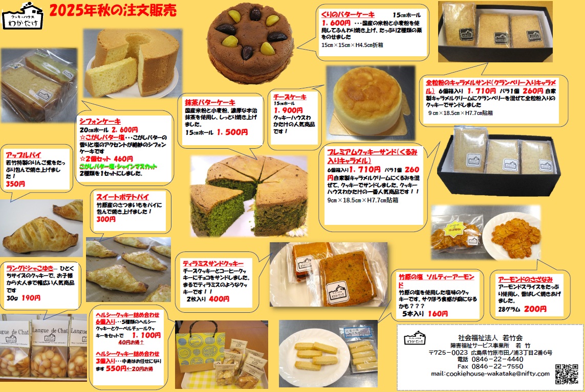 ご注文は、「注文票(エクセル)」を利用いただき、ファックス(0846-22-7550)か、メール(cookiehouse-wakatake@nifty.com)でご注文ください。